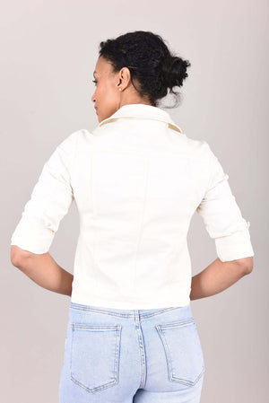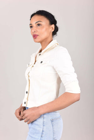 Getailleerd spijkerjack in crème met een vrouwelijke en tijdloze uitstraling. De aansluitende pasvorm zorgt voor een mooie vorm en draagt comfortabel. De knoopsluiting en borstzakken geven het jasje een klassieke denim look. Makkelijk te combineren met een broek, rok of jurk. Een fijn spijkerjack voor voorjaar en zomer.