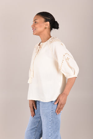 Deze luchtige blouse is gemaakt van zacht en ademend katoen, wat zorgt voor een comfortabel draaggevoel. Het model heeft een vrouwelijke V-hals met striksluiting en is afgewerkt met fijne broderie details op de schouders en mouwen. De driekwart mouwen en losvallende pasvorm geven de blouse een ontspannen, bohemian uitstraling.
