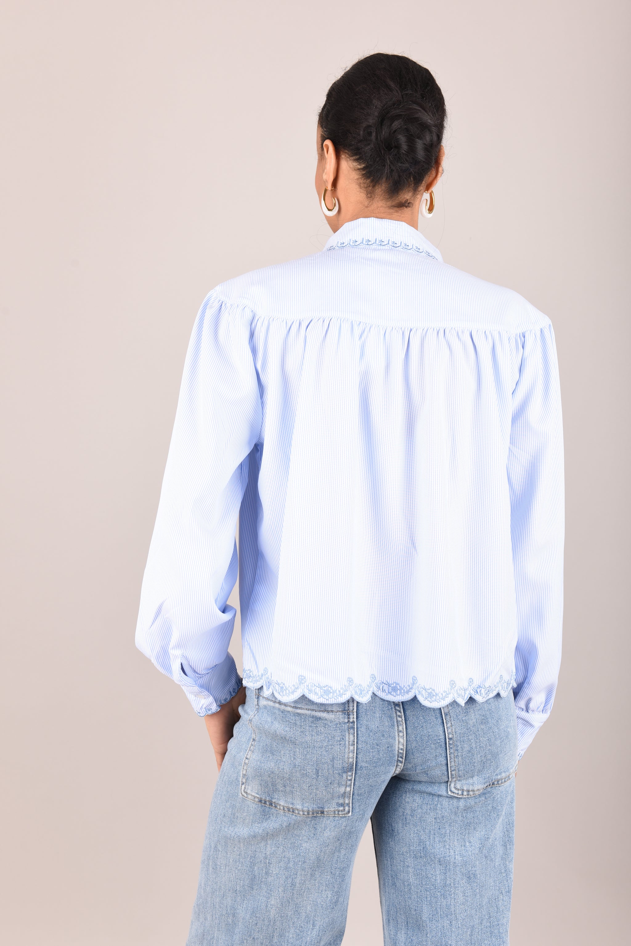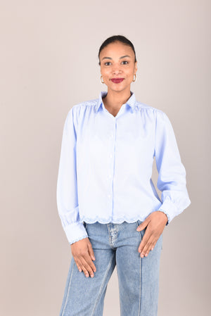 Deze dames blouse heeft een klassieke kraag en een knoopsluiting aan de voorkant. De lange mouwen zijn licht gerimpeld bij de schouder en sluiten af met een smalle manchet. Langs de onderzijde is de blouse afgewerkt met een geschulpte rand, wat een subtiel detail toevoegt. Het model valt recht en eindigt rond de taille.