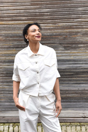 Korte blouse met een stoere en frisse uitstraling. De lichte stof draagt comfortabel en is prettig op warmere dagen. De borstzakken en knoopsluiting geven de blouse een casual look. Makkelijk te combineren met de bijpassende broek.