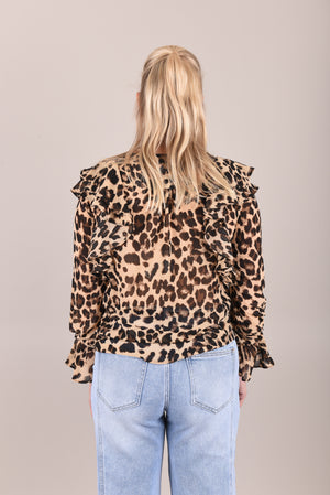 Deze statement blouse met leopard print geeft elke outfit een trendy en vrouwelijke uitstraling. Het model is uitgevoerd in een soepele, lichtgewicht stof en heeft een V-hals met knoopsluiting. De ruffles op de schouders en de licht uitlopende mouwen met ruches aan de manchetten zorgen voor een speels en elegant effect.