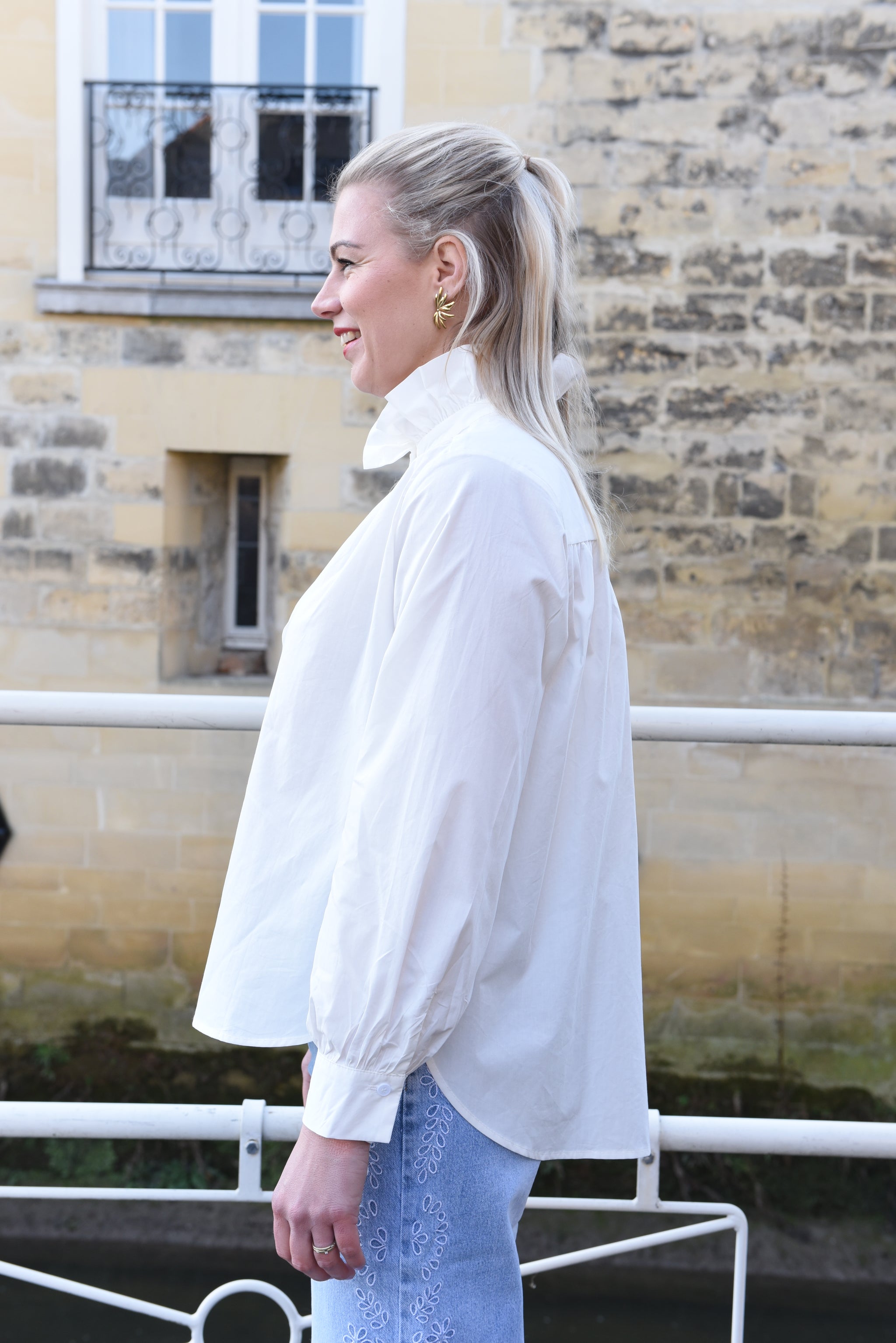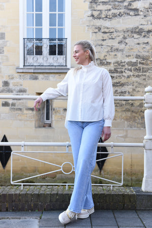 Deze tijdloze witte blouse van katoen is een elegante toevoeging aan elke garderobe. Het model is uitgevoerd in een lichte, comfortabele stof en heeft een verfijnde ruffle kraag die zorgt voor een vrouwelijke en klassieke uitstraling. De blouse heeft lange mouwen met manchetten en een knoopsluiting aan de voorzijde, waardoor hij zowel netjes als casual te dragen is.