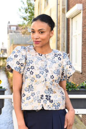 De blouse heeft een ronde hals en een knoopsluiting aan de voorzijde, waardoor het ontwerp klassiek en tijdloos blijft. De korte pofmouwen geven het geheel een modieus en vrouwelijk karakter.
