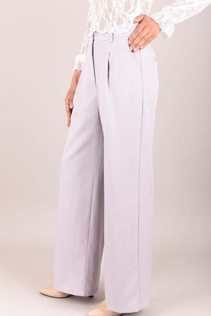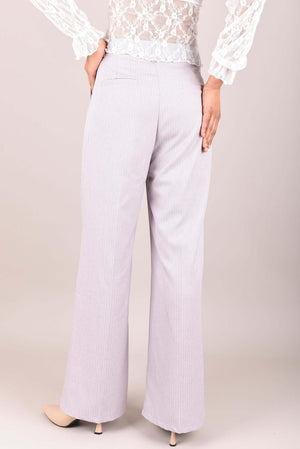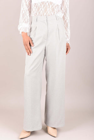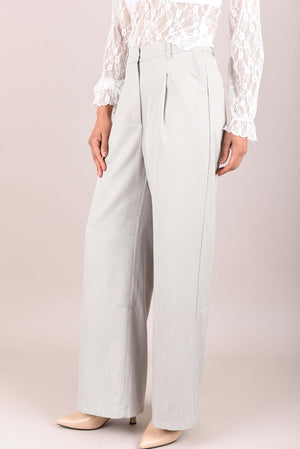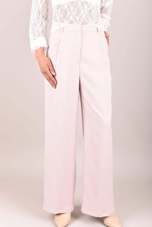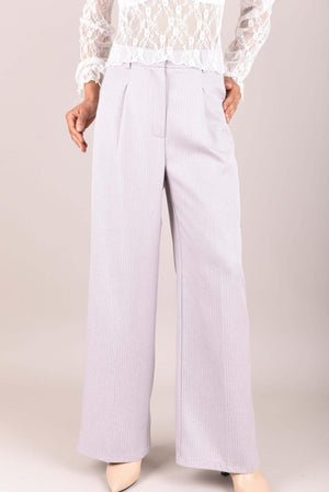 Deze dames broek heeft een hoge taille en wijde, recht vallende pijpen. Aan de voorkant is het model afgewerkt met een nette sluiting en subtiele plooien, wat zorgt voor een rustige belijning. De stof heeft een lichte structuur en valt soepel langs het been.