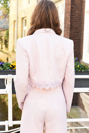 Langs de onderzijde en aan de manchetten is subtiel kant verwerkt, wat het jasje een romantisch en stijlvol detail geeft. De dubbele knoopsluiting en klassieke reverskraag maken het ontwerp compleet.