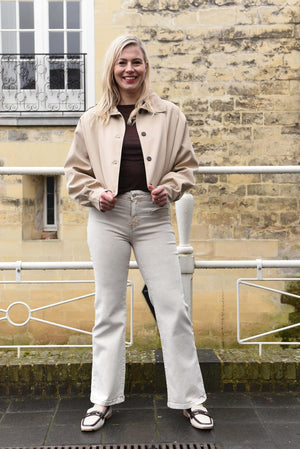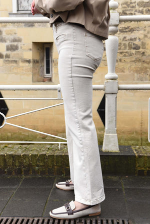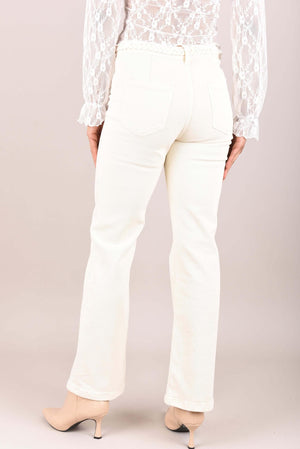 Deze dames jeans heeft een hoge taille en rechte pijpen die vanaf de heupen gelijkmatig naar beneden lopen. De tailleband is afgewerkt met een subtiel gevlochten detail, wat de jeans net een bijzonder accent geeft. Het model sluit met een rits en knoop en valt aansluitend bij de heupen, waarna de pijpen rustig recht doorlopen tot de zoom.