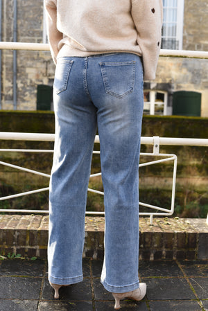 Deze lichtblauwe high waist jeans is een echte essential. De stof bevat veel stretch, waardoor de broek prachtig aansluit en tegelijk heerlijk comfortabel zit. De subtiele flared leg zorgt voor een elegant silhouet en laat je benen langer lijken. Perfect voor elke dag, van casual tot chic gestyled.
