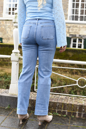 Deze lichtblauwe high waist jeans is een echte essential. De stof met veel stretch zorgt voor een perfecte pasvorm en optimaal draagcomfort. De subtiele flared leg geeft een elegant silhouet en laat je benen langer lijken. Voorzien van handige voorzakjes en een parelmoer knoopdetail voor een verfijnde touch. Perfect om casual of chic te stylen, elke dag opnieuw