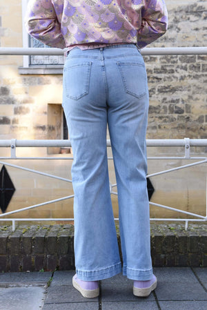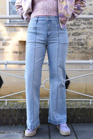 Deze lichtblauwe high-waist jeans heeft rechte pijpen en subtiele verticale stiksels die zorgen voor een slank silhouet. De comfortabele denim stof en moderne pasvorm maken deze broek ideaal voor zowel casual als stijlvolle outfits. Makkelijk te combineren met sneakers, sandalen of hakken.