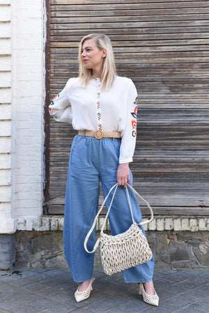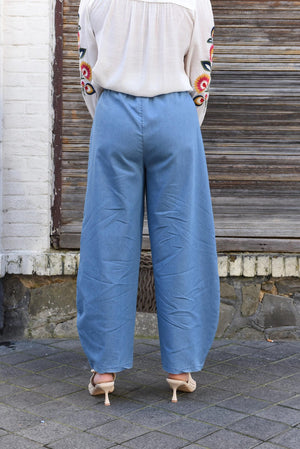 Deze luchtige dames broek heeft een moderne, wijde pasvorm die comfortabel draagt en mooi valt. De zachte, soepele stof geeft de broek een casual uitstraling met een subtiel denim effect, zonder zwaar aan te voelen.
