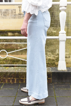 Deze dames broek heeft een hoge taille en wijde, recht vallende pijpen. De stof is uitgevoerd met fijne lijnen wat zichtbaar is over de hele broek. Het model sluit mooi aan bij de taille en valt soepel langs het been tot op de enkel.