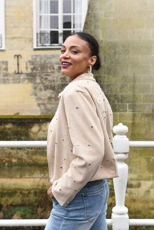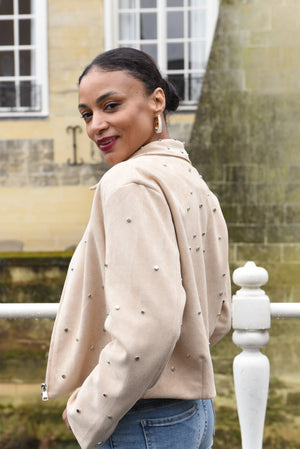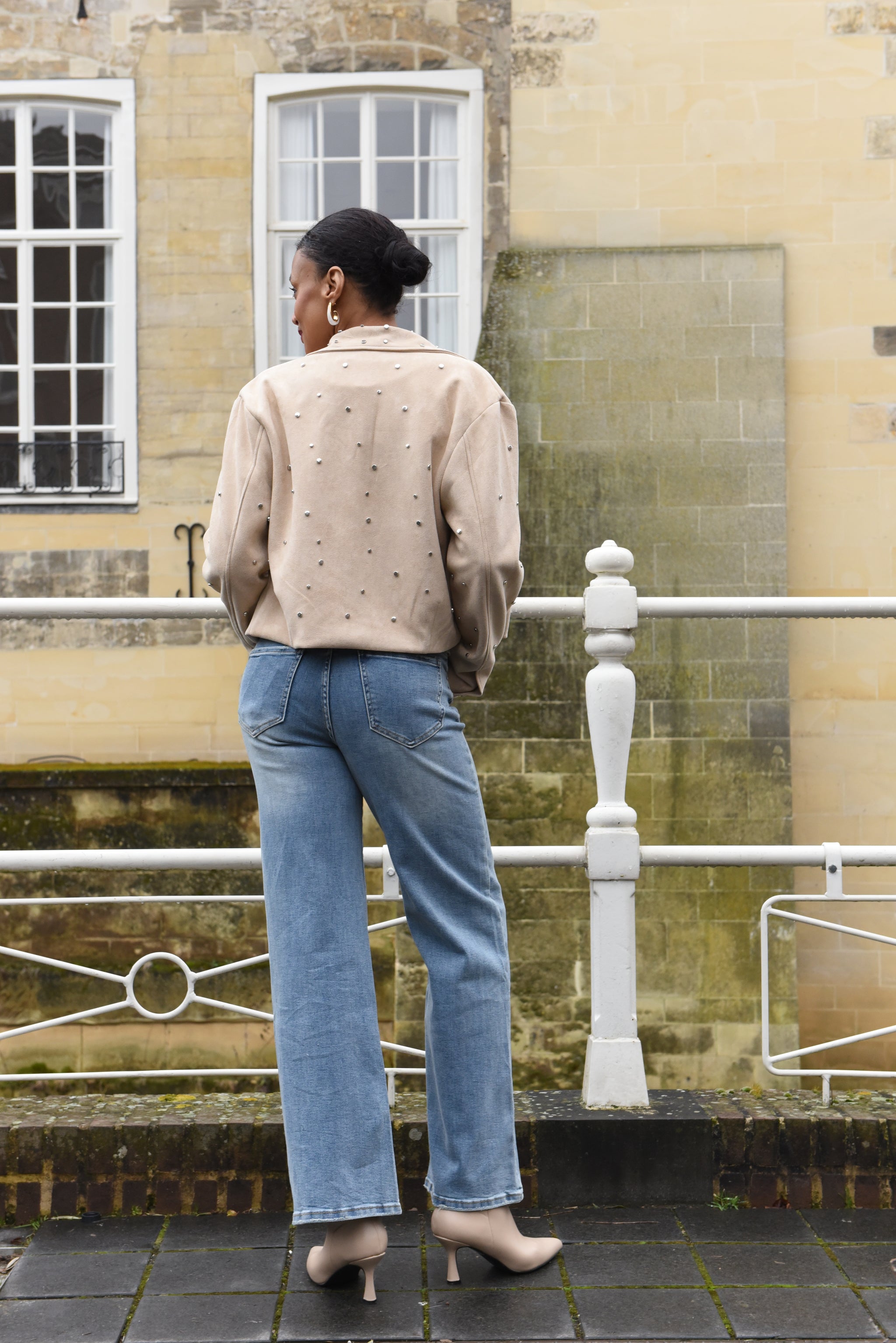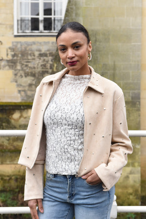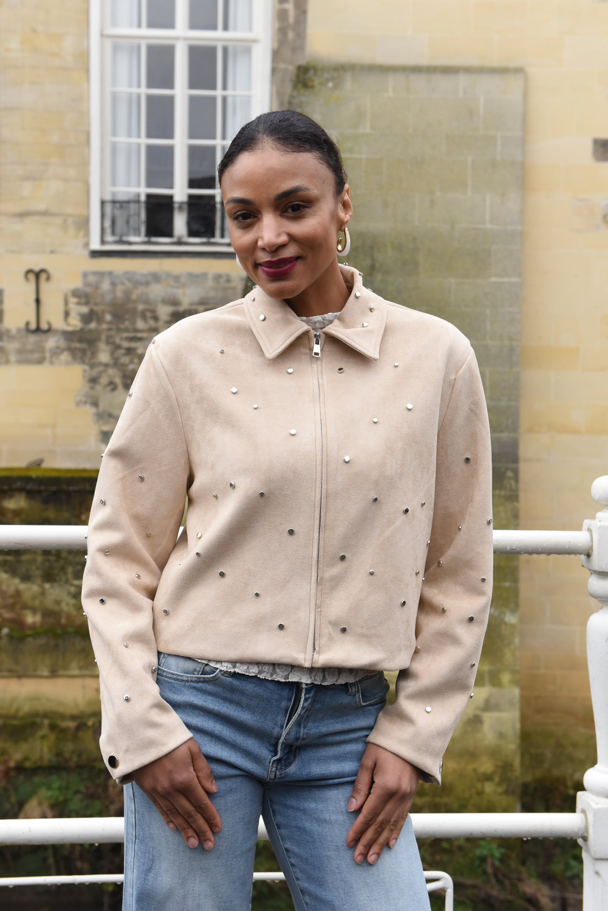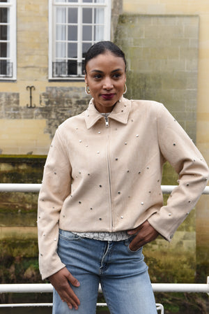 Deze dames jas in suède look heeft een rechte, korte pasvorm en sluit met een rits aan de voorkant. De jas is voorzien van een klassieke kraag en lange mouwen. Over het hele oppervlak zijn kleine studs aangebracht, wat zorgt voor een subtiel decoratief effect. Het model valt tot op de taille en heeft een strakke, verzorgde uitstraling.