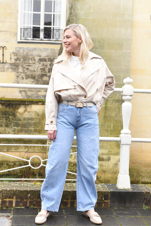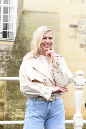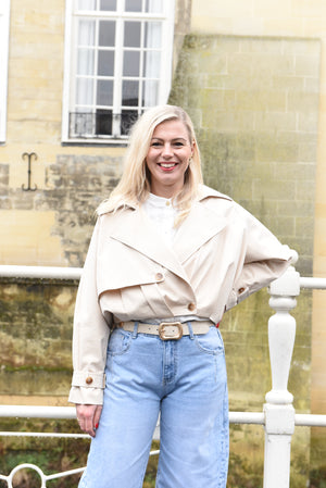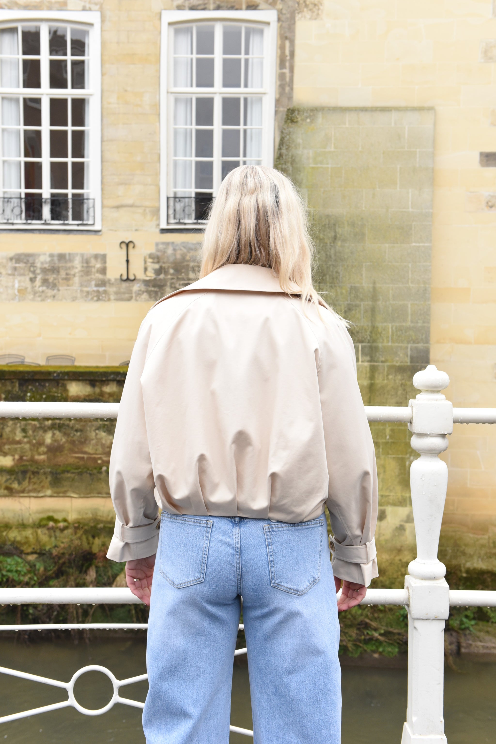 Deze korte dames trenchcoat heeft een moderne pasvorm en een tijdloos design met knoopsluiting en reverskraag. Licht en comfortabel om te dragen, ideaal als tussenjas voor het voor- en najaar. Makkelijk te combineren met elke outfit.