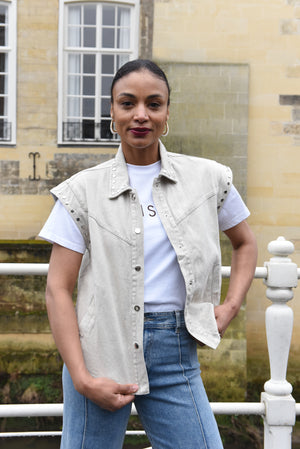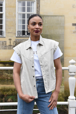 Dit dames gilet is uitgevoerd in denim en heeft een mouwloos model met een kraag en drukknopen aan de voorkant. Langs de schouders en kraag zijn studs aangebracht als decoratief detail. Het gilet valt recht en wordt hier open gedragen over een T-shirt.