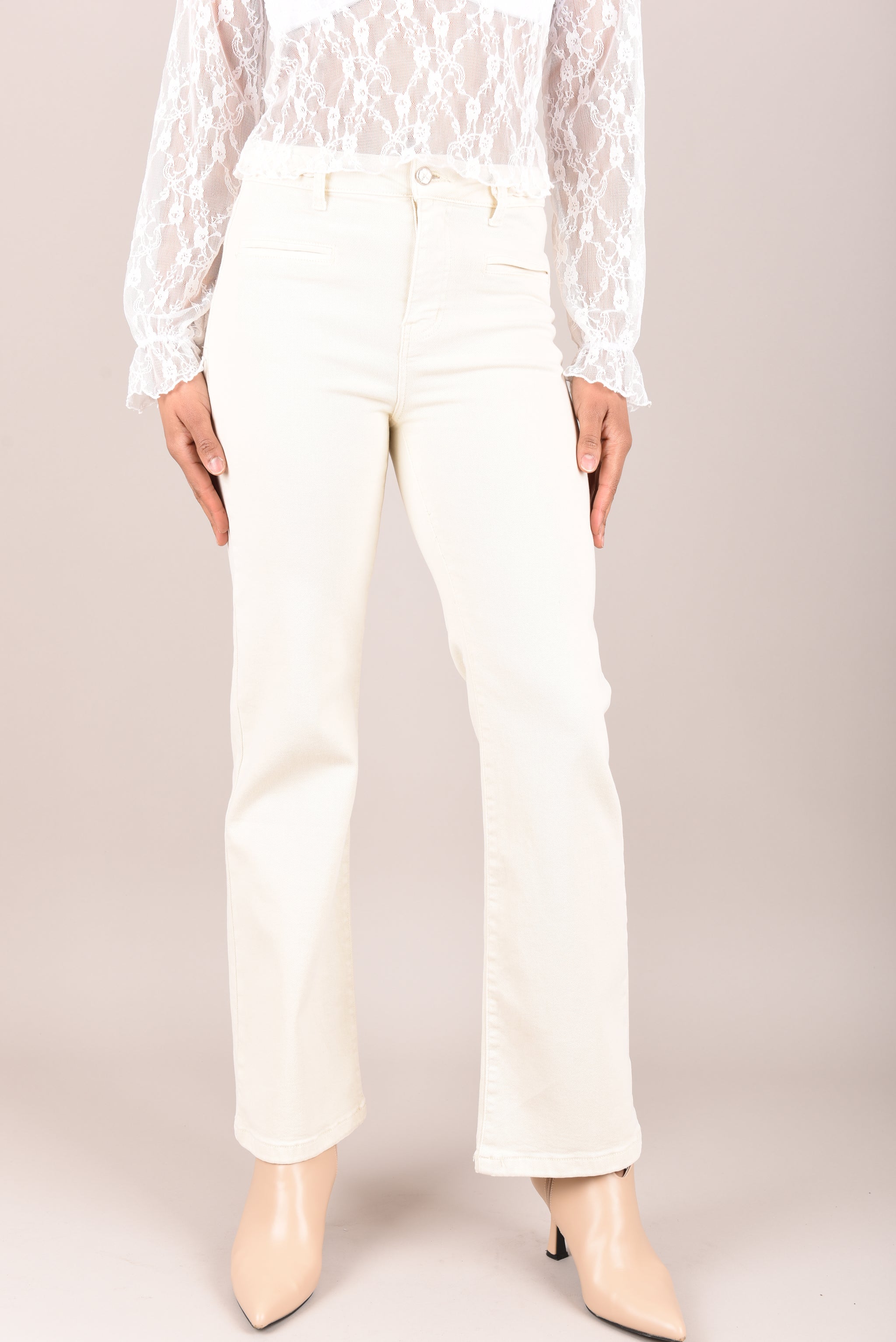 Deze dames jeans heeft een hoge taille en rechte pijpen die vanaf de heupen gelijkmatig naar beneden lopen. De tailleband is afgewerkt met een subtiel gevlochten detail, wat de jeans net een bijzonder accent geeft. Het model sluit met een rits en knoop en valt aansluitend bij de heupen, waarna de pijpen rustig recht doorlopen tot de zoom.