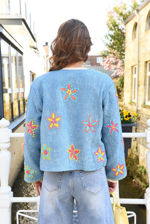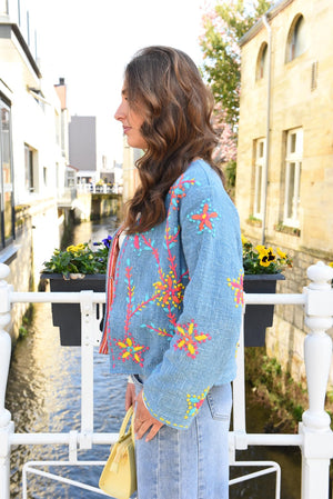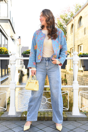 Kort jasje met rijk borduursel dat zorgt voor een opvallend en ambachtelijk karakter. De openvallende voorkant zonder sluiting geeft het ontwerp een ontspannen uitstraling en maakt het ideaal voor gelaagde looks.
