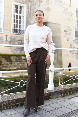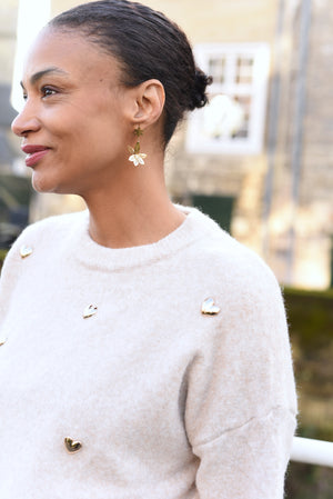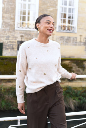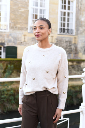 Een heerlijke warme wintertrui, versierd met glimmende hartjes die direct opvallen.