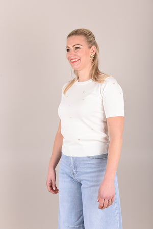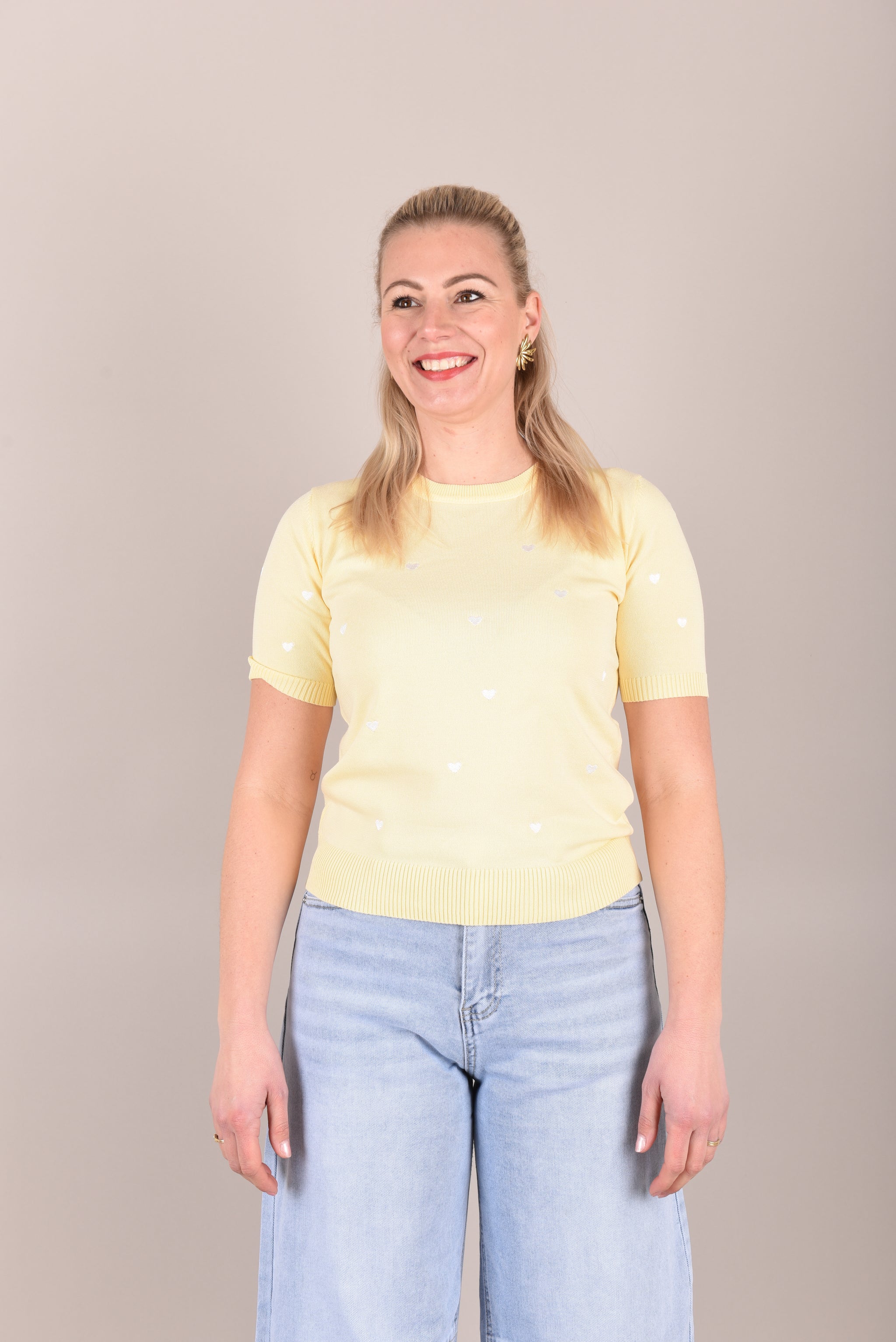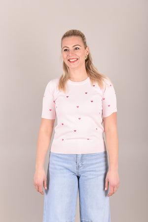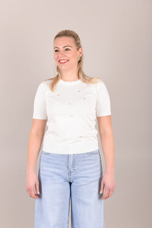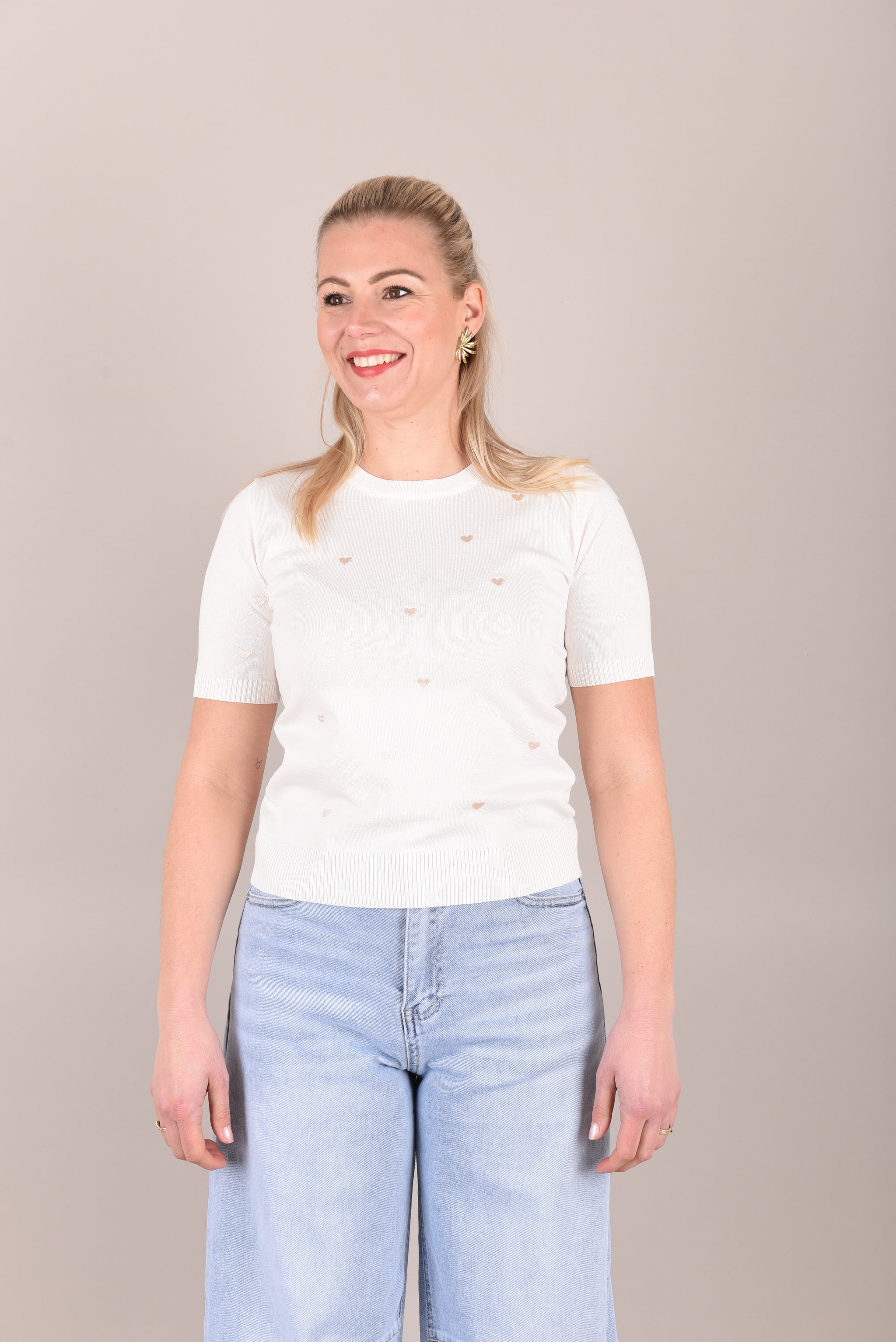 Deze fijne gebreide top is een elegante basic met een speelse twist. Het shirt is uitgevoerd in een zachte, comfortabele knit en heeft een aansluitende pasvorm. De subtiele opengewerkte hartjesdetails geven het T-shirt een vrouwelijke en verfijnde uitstraling.