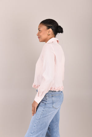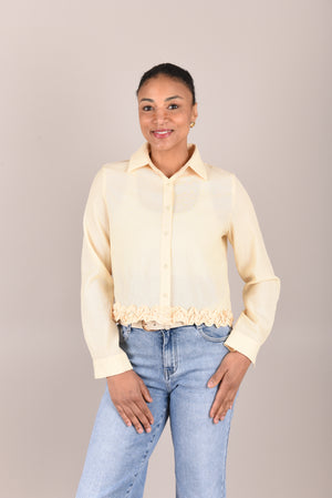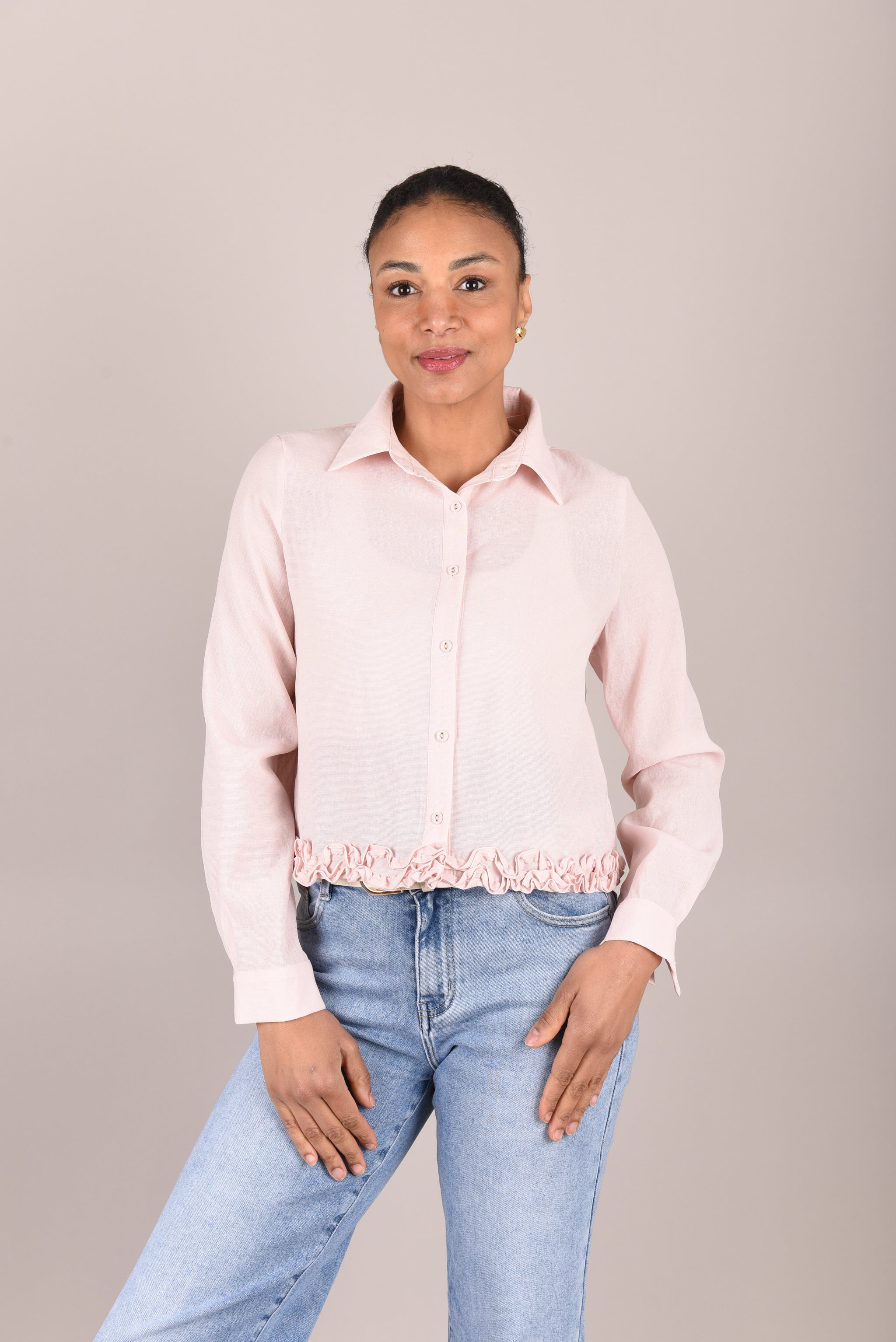 Deze elegante blouse is vervaardigd uit een natuurlijke mix van linnen en viscose, wat zorgt voor een luchtig, soepel en comfortabel draaggevoel. Het model heeft lange mouwen, een klassieke kraag en een knoopsluiting aan de voorzijde. De fijne ruffle afwerking aan de onderzoom geeft de blouse een vrouwelijke en verfijnde uitstraling.