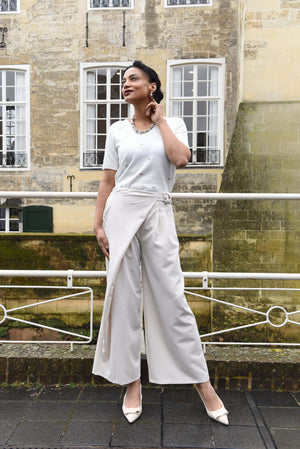 Mooie lichte broek met een elegante pasvorm en elastische tailleband. De stof valt fijn en beweegt makkelijk mee tijdens het dragen. De overslag en gesp geven de broek een leuk en net even anders detail. Combineert eenvoudig met een blouse of top voor een fijne outfit. Een comfortabele broek die je makkelijk de hele dag draagt.
