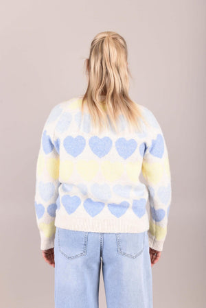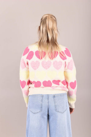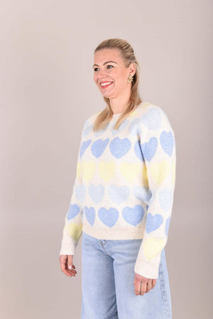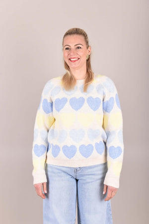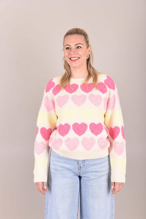 Deze lieve trui is een echte eyecatcher dankzij het speelse hartjespatroon in zachte pastelkleuren. De trui is gemaakt van een zacht, comfortabel breisel en heeft een rechte, licht losvallende pasvorm. De ronde hals en lange mouwen zorgen voor een tijdloos silhouet, terwijl het patroon een vrolijke en vrouwelijke touch toevoegt.