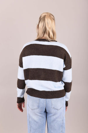 Deze comfortabele trui is gemaakt van een zachte wolmix en voelt heerlijk warm en licht aan. Het brede streeppatroon in zacht roze of poederblauw met donkerbruin geeft de trui een moderne, speelse uitstraling. De rechte, iets losse pasvorm en lange mouwen zorgen voor optimaal draagcomfort en maken dit item perfect voor dagelijks gebruik.