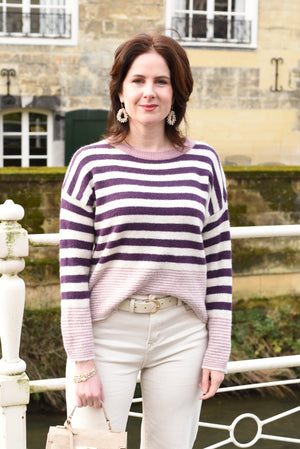 Een zachte wolmix trui met een warme beige basis, verfraaid met speelse strepen in paars en roze. Comfortabel en licht van gewicht, perfect om casual te dragen of stijlvol te combineren voor een vrolijke, verfijnde look.
