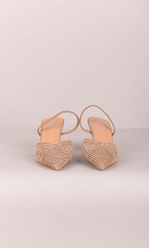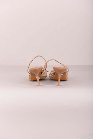 Deze slingbacks combineren een elegante vorm met een verfijnde, geweven structuur in natuurlijke tinten. De subtiel opengewerkte weving geeft het model een bohemian uitstraling, terwijl het slanke silhouet zorgt voor een vrouwelijke en stijlvolle finish. Luchtig, karaktervol en perfect voor zonnige dagen.
