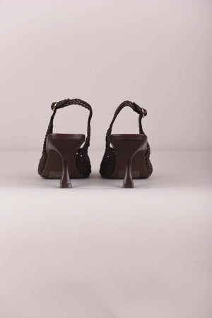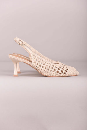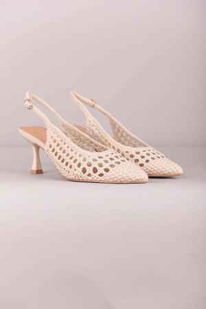 Deze slingbacks combineren een elegante vorm met een verfijnde, geweven structuur in natuurlijke tinten. De subtiel opengewerkte weving geeft het model een bohemian uitstraling, terwijl het slanke silhouet zorgt voor een vrouwelijke en stijlvolle finish. Luchtig, karaktervol en perfect voor zonnige dagen.