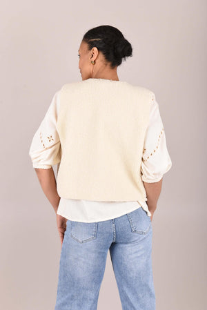 Dit charmante gilet is een echte blikvanger dankzij de fijne bloemenborduursels langs de randen. Het model is uitgevoerd in een zachte, licht gestructureerde stof en heeft een open voorkant, waardoor het perfect is om te layeren over een blouse of top. De contrasterende borduursels geven het gilet een bohemian en vrouwelijke uitstraling.