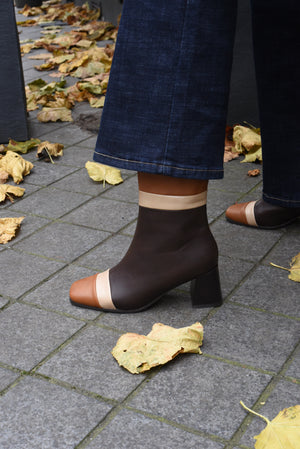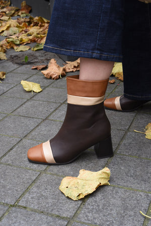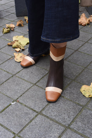 Weer een prachtig paar enkellaarzen in lederlook, uitgevoerd in beige met camel en bruin. De blokhak en de subtiel vierkante neus geven ze een moderne, tijdloze uitstraling. Een must-have voor iedere schoenencollectie, perfect voor de herfst en winter.
