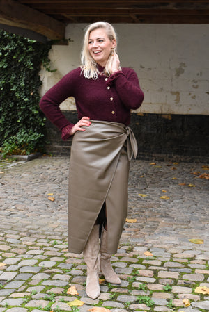 Strik wikkelrok verkrijgbaar in drie kleuren, met een prachtige afwerking. De rok wordt voor het effect gestrikt, maar is onder de wikkel volledig dichtgenaaid, zodat hij nooit open kan vallen. Dankzij de elastische band aan de achterkant sluit hij mooi aan op de taille voor een comfortabele en flatterende pasvorm. Fantastisch voor tijdens de feestdagen of gewoon zo, omdat het kan ;)