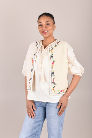 Dit charmante gilet is een echte blikvanger dankzij de fijne bloemenborduursels langs de randen. Het model is uitgevoerd in een zachte, licht gestructureerde stof en heeft een open voorkant, waardoor het perfect is om te layeren over een blouse of top. De contrasterende borduursels geven het gilet een bohemian en vrouwelijke uitstraling.