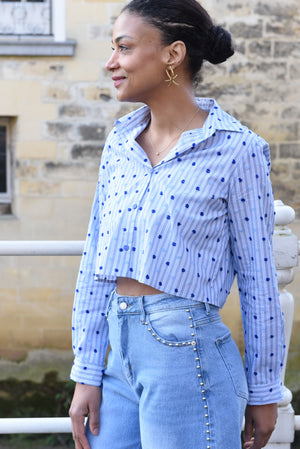 Deze speelse cropped blouse is uitgevoerd in een lichtblauwe stof met fijne verticale strepen en contrasterende blauwe stippen. Het model heeft lange mouwen en een klassieke kraag, wat zorgt voor een frisse, casual uitstraling.