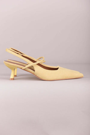 Deze slingbacks hebben een strak, modern design en zijn uitgevoerd in vier kleuren: botergeel, pistache, beige en coffee. Het minimalistische model geeft elke outfit een stijlvolle en eigentijdse uitstraling.
